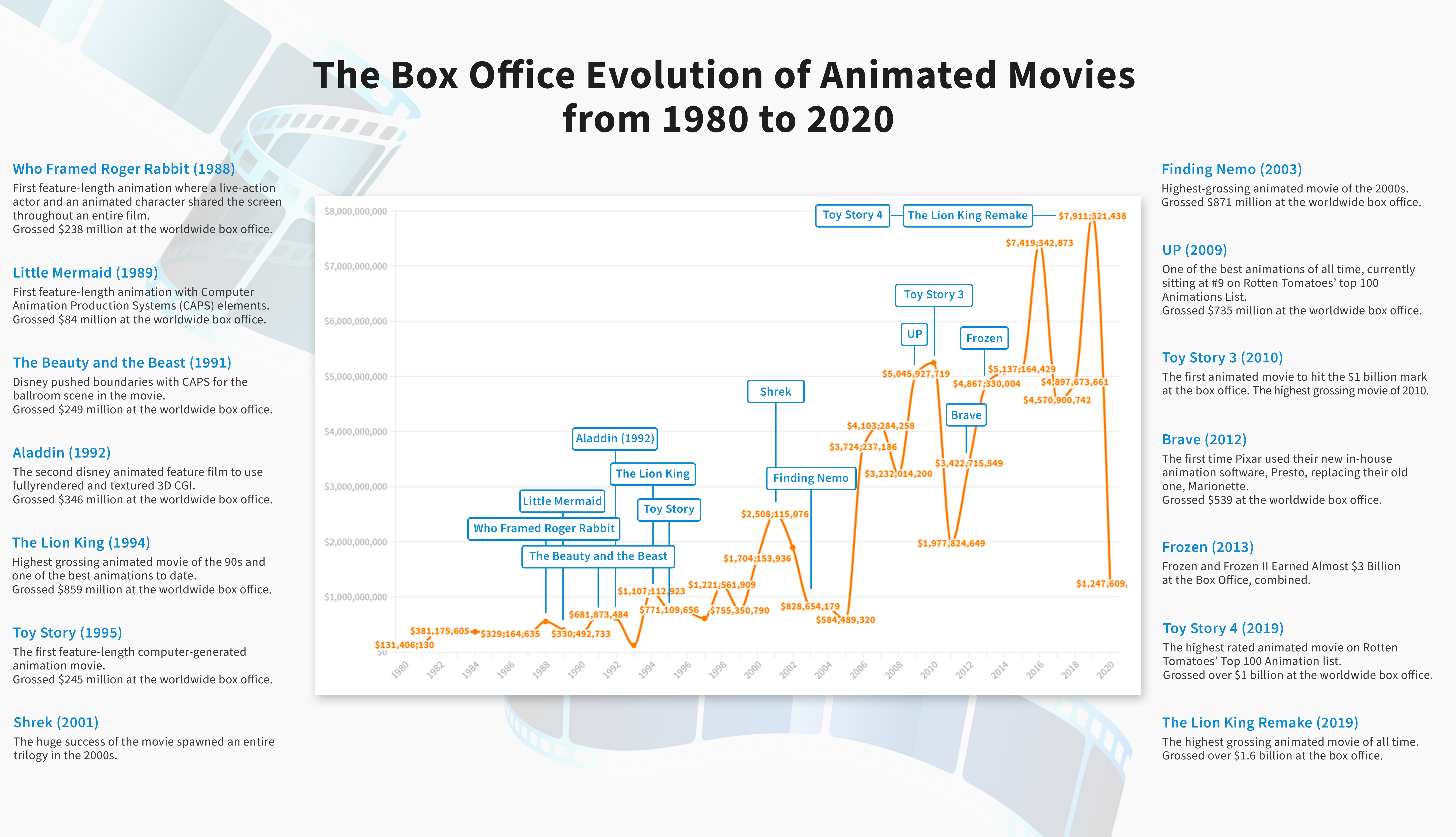 For this study, we looked at the same time period (1980 through 2020), but we focused exclusively on the evolution of animated movies. Read on to see what we’ve found and make sure to check out the chart below.